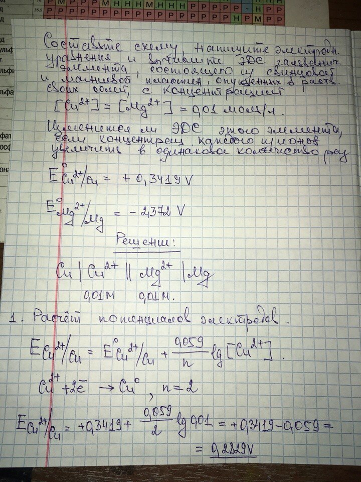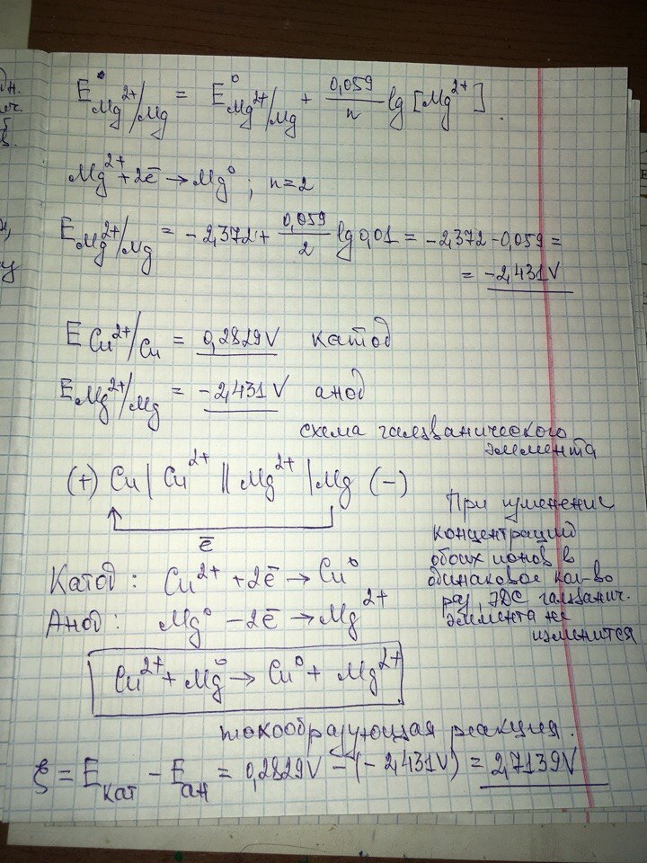 Составьте схему, напишите электронные уравнения электродных процессов и вычислите ЭДС гальванического элемента, состоящего из свинцовой и магниевой пластин, опущенных в растворы своих солей с концентрацией