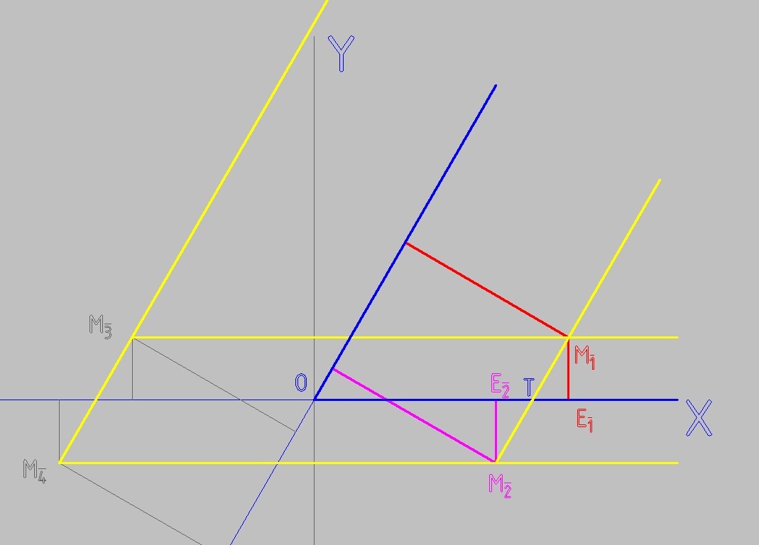Точка М₁ действительно генерирует треугольники с большим периметром. Вычисление минимального периметра мне не удалось, но периметр четырёхугольника, образованного сторонами угла и перпендикуляром к ним равен