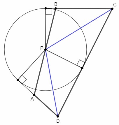 Биссектриса угла - геометрическое место точек, равноудаленных от сторон угла. Точка P лежит на биссектрисе угла BCD, следовательно равноудалена от сторон BC, CD. Точка P лежит на биссектрисе угла CDA, следовательно равноудалена от сторон CD, AD. Таким образом, точка P равноудалена от трех сторон: BC, CD, AD.