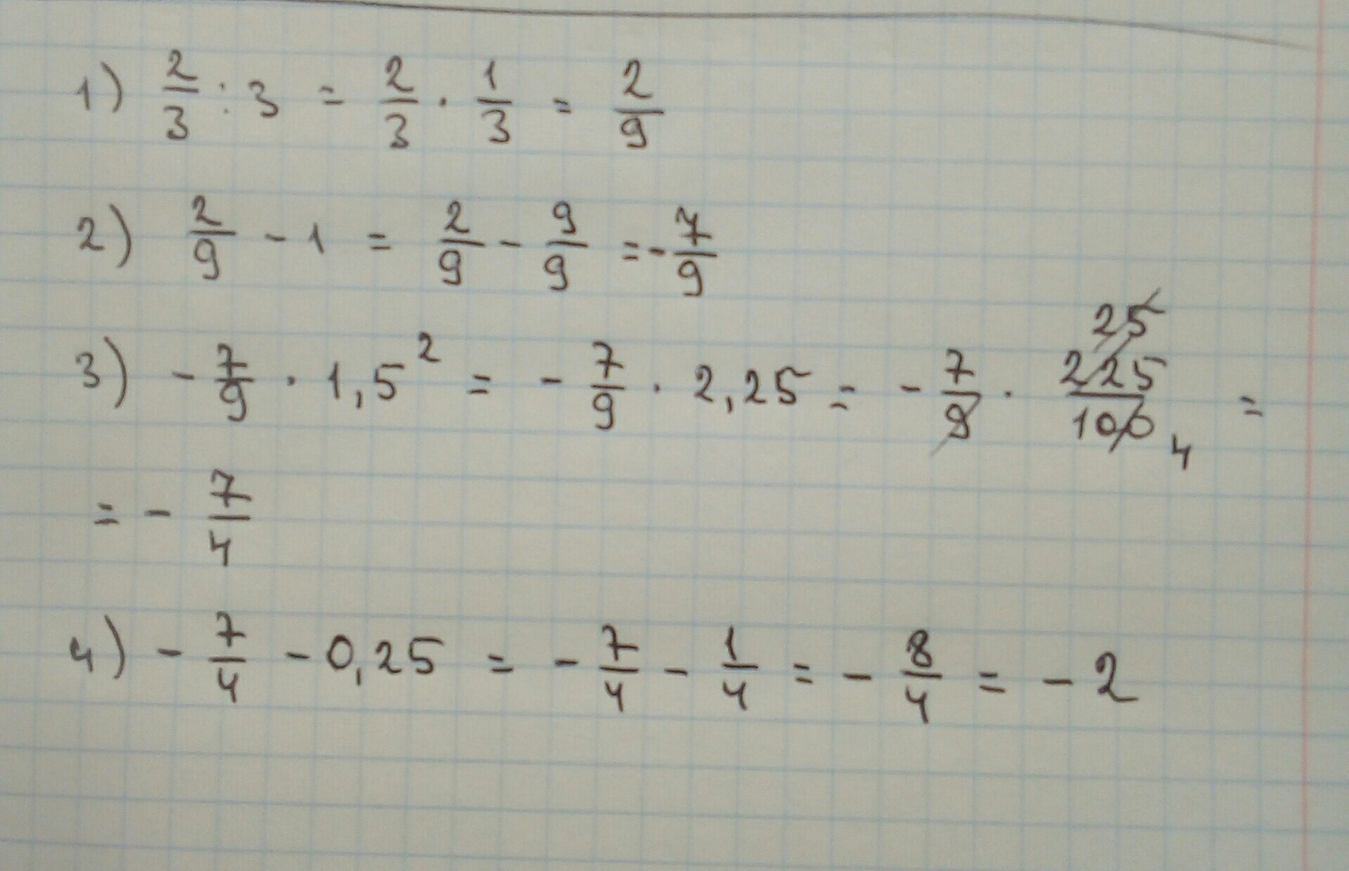 (2/3*1/3-1)*1,5²-1/4=(2/9-1)*1,5²-1/4=(-7/9)*1,5²-1/4=-7/9*(3/2)²-1/4=-7/9*9/4-1/4=7*1/4-1/4=-7/4-1/4=-2