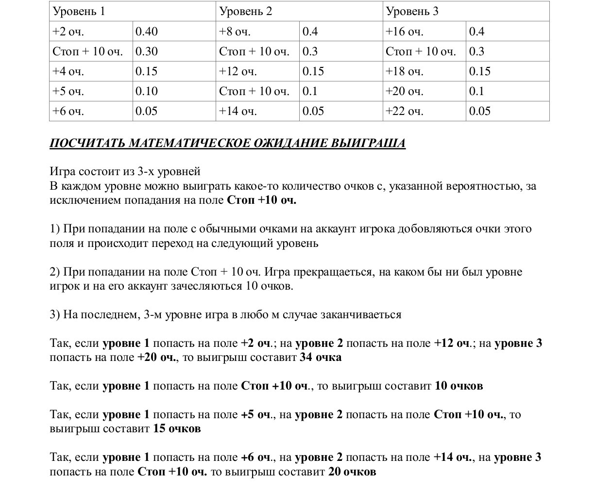 . На третьем уровне матожидание прибавления числа очков игрока, дошедшего до этого уровня, будет равно