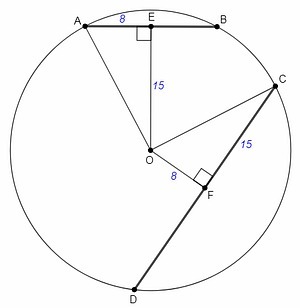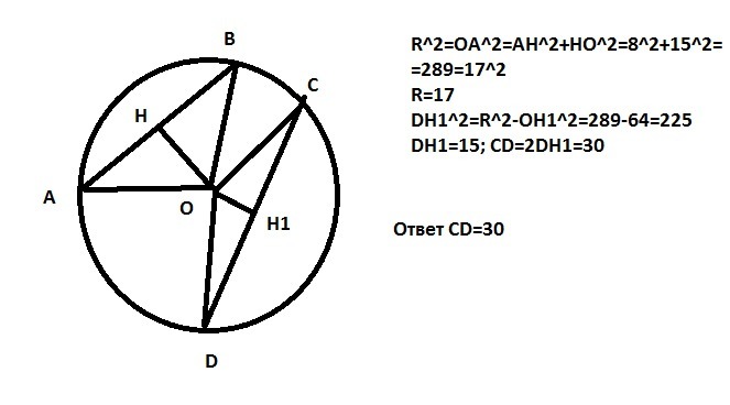 В окружности проведены хорды АВ и СД, которые удалены от центра на 15 и 8 соответственно. Найдите хорду СД, если хорда АВ равна 16.
