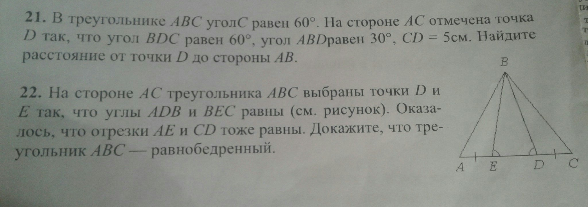 Угол C = 60 . Отметим точку Д так , что БДС = 60 значит, ДБС тоже равен 60 -> равносторонний -> СД = БД = СБ = 5 см. Угол ДБА равен 30 -> СБА равен 90 . Сумма углов треугольника = 180 -> угол СБА = 180 - 90 - 60 = 30 -> треугольник ДБА - равнобедренный-> ДА = СД = 5 см. Проведём расстояние до АБ ( пусть будет отрезок х) из точки Д оно пересекает АС и делит АС пополам так же он пересекает АБ под прямым углом. Не забываем про то, что угол СБА = 90 значит отрезок х параллелен основанию треугольника и он делит СА пополам -> он - средняя линия -> равен половине основания -> равен 5/2 = 2,5
