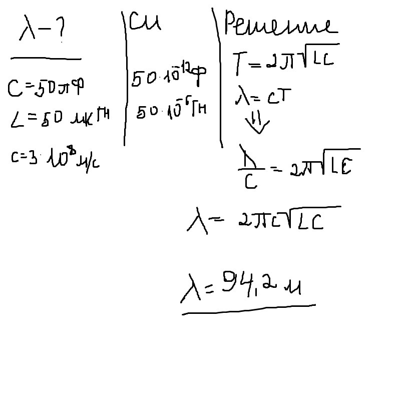 Какой длины волны принимает радиоприемник ,если емкость конденсатора его колебательного контура равна 50пФ , а индуктивность 50 мкГн