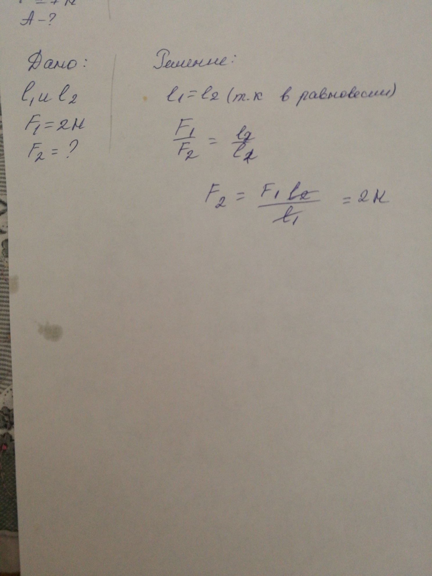 рычаг, плечи которого l и l2 находится в равновесии. Сила действующая на короткое плечо, равна 2H. Чему равна сила, действующая на длинное плечо?
