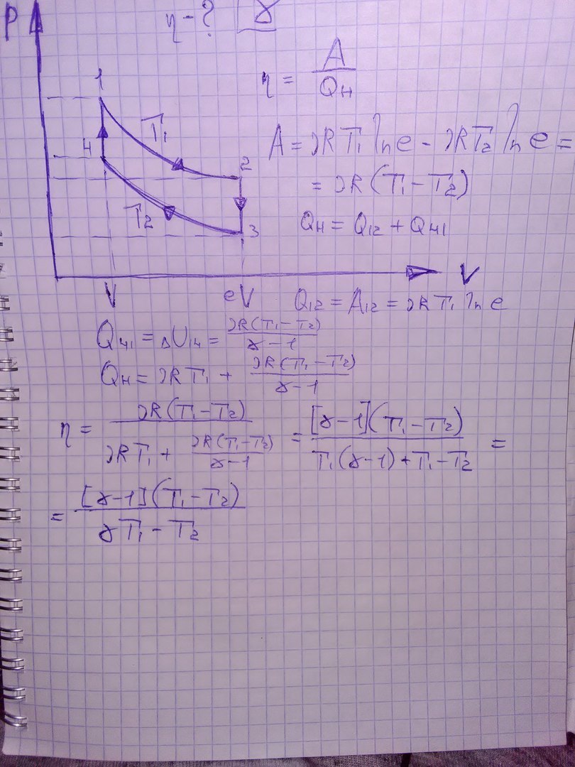 Идеальный газ (γ известно) совершает круговой процесс, состоящий из двух изотерм и двух изохор. Изотермические процессы протекают при температурах T1 и T2 (T1>T2), изохорические — при объемах V1 и V2 (V2 в e раз больше, чем V1). Найти к. п. д. η цикла.
