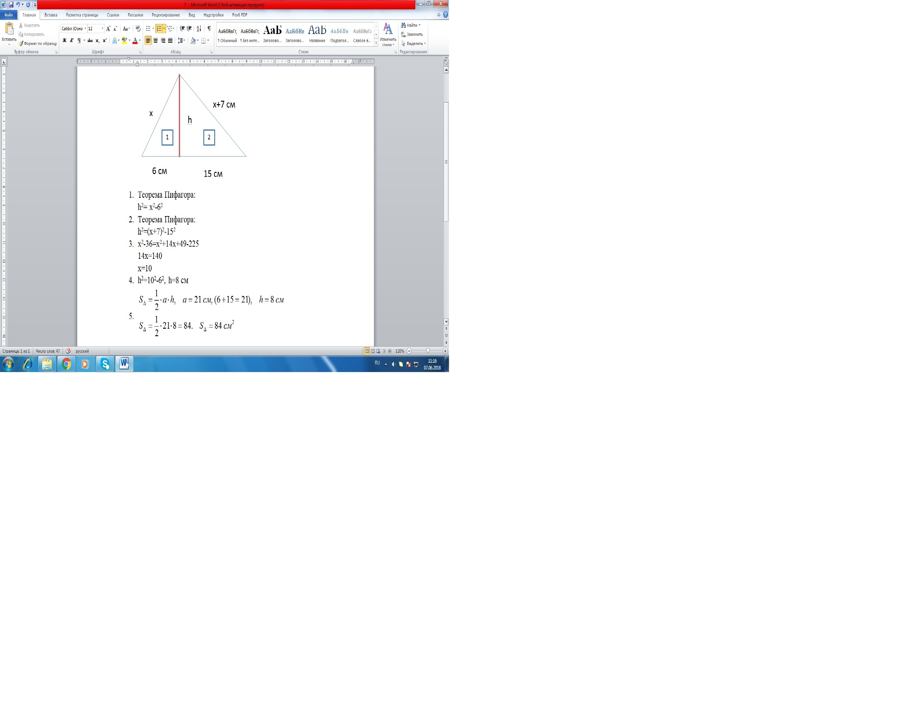Высота треугольника делит фундамент ра 6 см и 15см в длину. Вычислите область треугольника,если боковая разность составляет 7 см