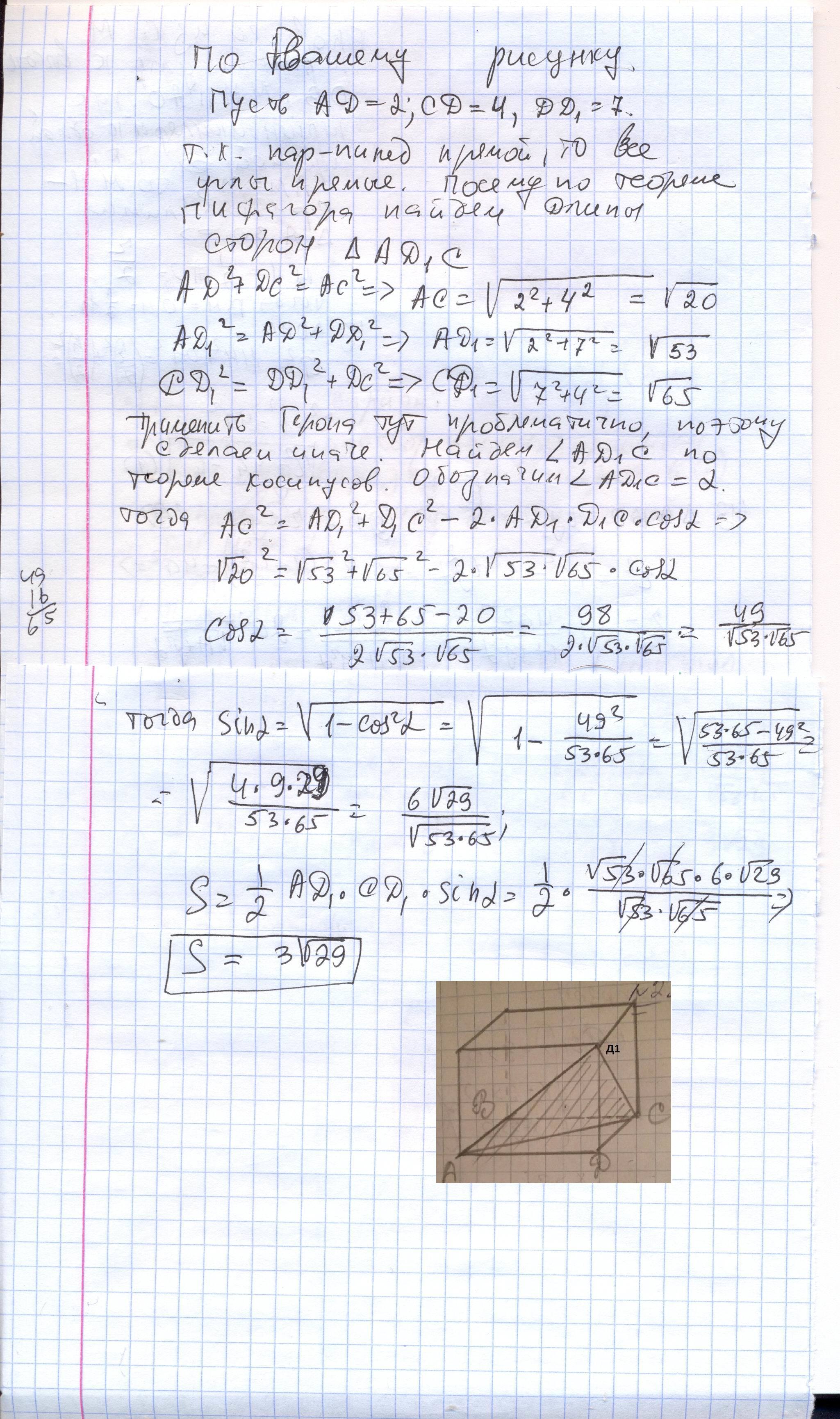 Через конец ребер, выходящих из одной вершины прямоугольного параллелепипеда с размерами 2, 4, 7 см проведена плоскость. найдите площадь сечения.