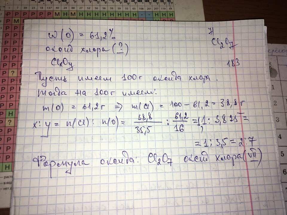 В некотором оксиде хлора массовая доля атомов кислорода составляет 61.2%.Установите формулу оксида.