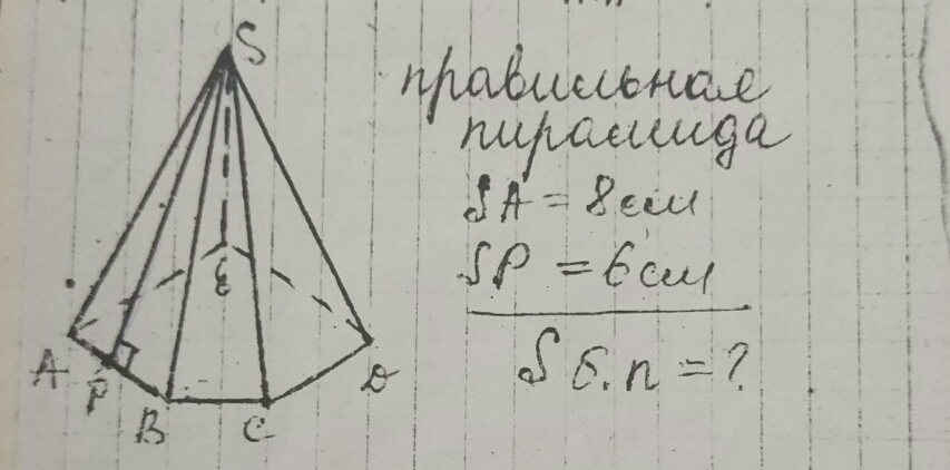 1) AP = sqrt (SA^2-SP^2) = sqrt (64-36) = sqrt (28) = 2sqrt(7)
