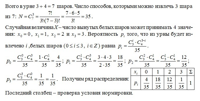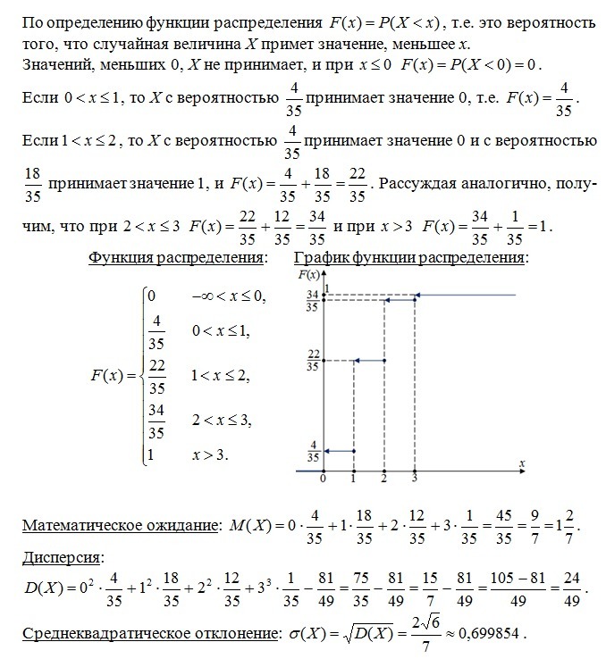 Из урны, содержащей 3 белых и 4 черных шара, вынимают на удачу 3 шара. Найти закон распределения Х – числа вынутых белых шаров. Составить функцию распределения случайной величины F(x) и изобразить ее график. Вычислить М(Х), Д(Х), σх..