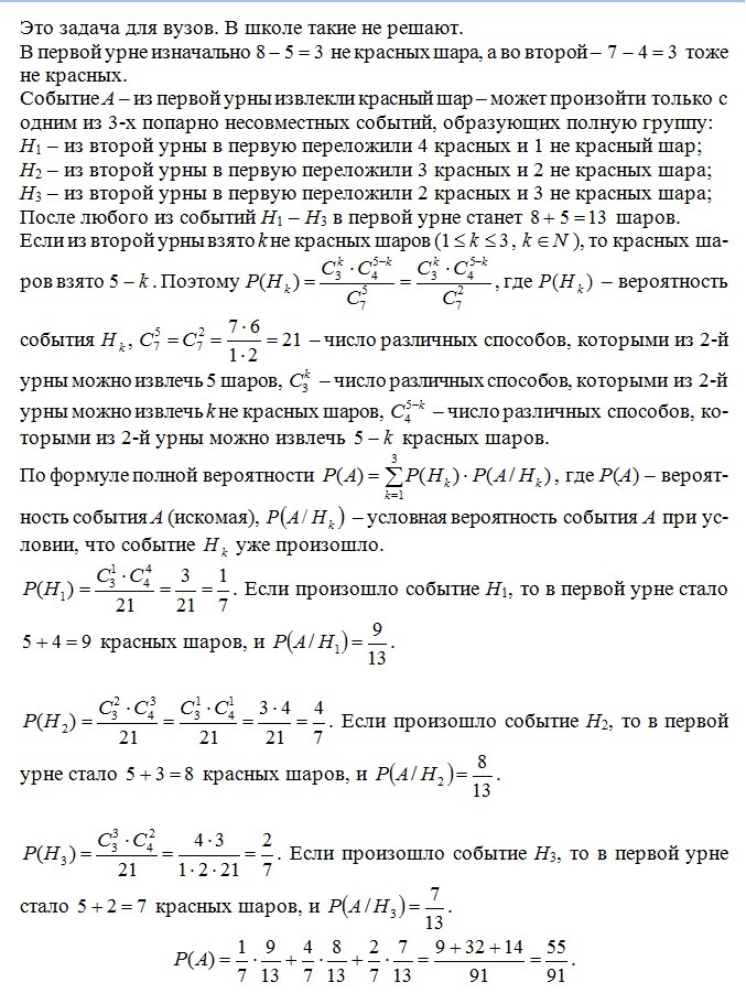 В первой урне содержится 8 шаров, из них 5 красных; во второй урне 7 шаров, из них 4 красных. Из второй урны в первую переложили 5 шаров, а затем из первой урны наудачу извлекли один шар. Найти вероятность того, что извлекли красный шар.