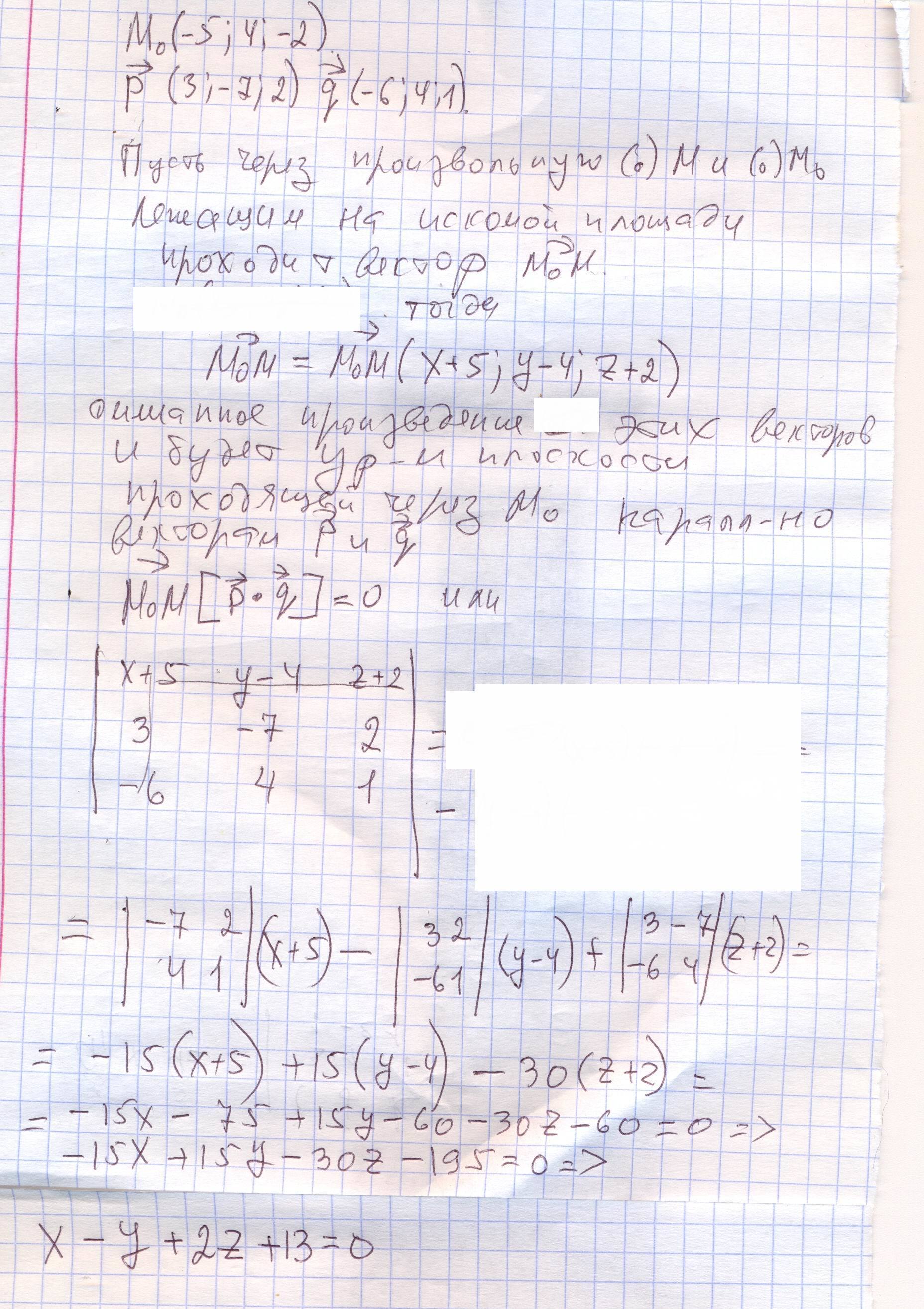 Составить уравнение плоскости, проходящей через заданную точку М(-5;4;-2), параллельно двум неколлинеарным векторам р(3;-7;2) и q(-6;4;1)