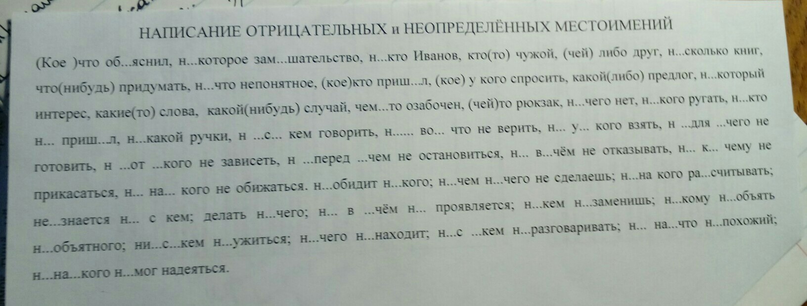кое-что объяснил, некоторое замешательство,некто Иванов,кто-то чужой, чей-либо друг, несколько книг, что-нибудь придумать,нечто непонятное, кое-кто пришёл,кое у кого спросить, какой-либо предлог,некоторый интерес, какие-то слова, какой-нибудь случай, чем-то озабочен, чей-то рюкзак, ничего нет,некого ругать,никто не пришёл, никакой ручки,не с кем поговорить,ни во что не верить,не у кого взять,ни для чего не готовить,ни от кого не зависеть,ни перед чем не остановиться,ни в чём не отказывать,ни к чему не прикасаться,ни на кого не обижаться,не обидит никого,ничем ничего не сделаешь,не на кого рассчитывать,не знается ни с кем, делать нечего,ни в чем не проявляется,никем не заменишь,никому не объять необъятного,ни с кем не ужиться, ничего не находит,ни с кем не разговаривать,ни на что не похожий,ни на кого не мог надеяться.