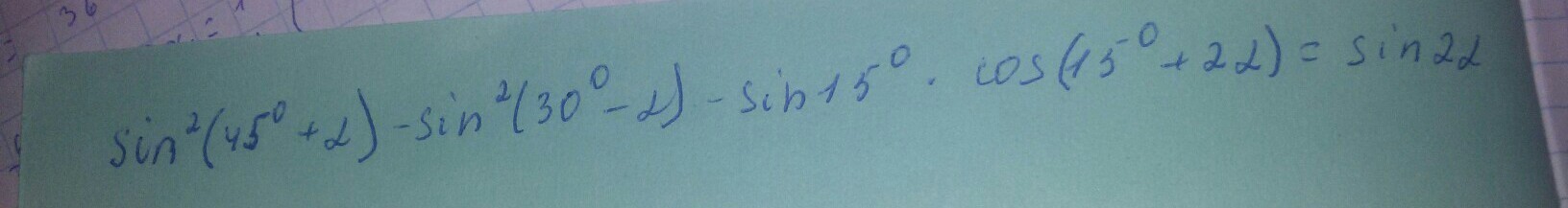 (sin(45+a))^2 - (sin(30 - a))^2 - sin(15)* cos(15 + 2*a) = sin(2*a);