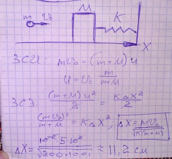 Пуля массой 0.01кг летит горизонтально со скоростью 500 м/с , влетает в куб массой 10кг и застревает в нем . Куб связан с вертикальной стенов пружиной упругостью 200 h/m , на сколько сильно согнется пружина ?