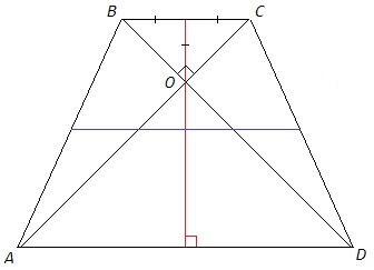 Диагонали равнобедренной трапеции образуют на основаниях два равнобедренных треугольника, △AOD, △BOC. В равнобедренных треугольниках высота является медианой, медиана из прямого угла равна половине гипотенузы - высоты в треугольниках △AOD, △BOC равны половинам оснований AD и BC. Следовательно, высота данной трапеции равна полусумме оснований, то есть средней линии, h=m.