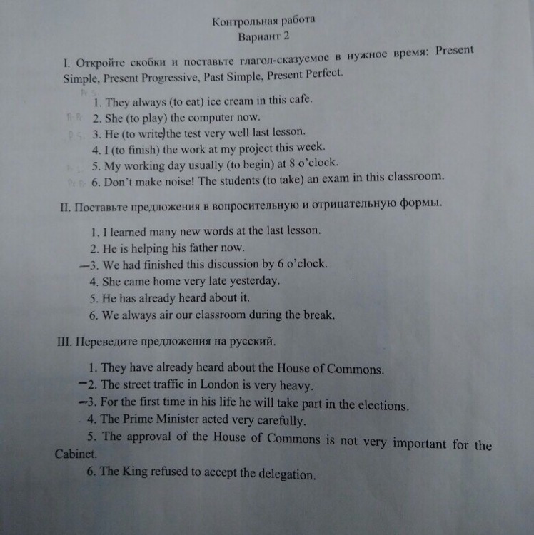 (1) 1 They always eat ice cream in this cafe. 2 She's playing the computer now. 3 He wrote the test very well last lesson. 4 I've finished the work at my project this week. 5 My working day usually begins at 8 o'clock. 6 Don't make noise! The students are taking an exam in this classroom. (2) Negative sentences. 1 I didn't learn many new words at the last lesson. 2 He isn't helping his father now. 3 We hadn't finished this discussion by 6 o'clock. 4 She didn't come home very late yesterday. 5 He hasn't already heard about it. 6 We don't always air our classroom during the break. Interrogative sentences. 1 Did I learn many new words at the last lesson? 2 Is he helping his father now? 3 Had we finished this discussion by 6 o'clock? 4 Did she come home late yesterday? 5 Has he already heard about it? 6 Do we always air our classroom during the break? (3) 1 Они уже слышали о палате общин. 2 В Лондоне сложное уличное движение. 3 Впервые в своей жизни, он будет принимать участие в выборах электрики. 4 Прайм Министерства принимает решения очень аккуратно. 5 Это утверждение палаты общин является не очень важным для этого кабинета. 6 Этот король отказывается принимать делегацию.