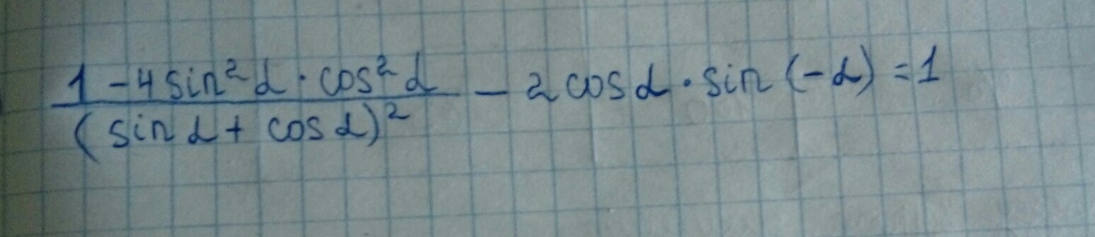 ((1-4sin²αcos²α)/(sinα+cosα)²)-2cosαsin(-α)=1