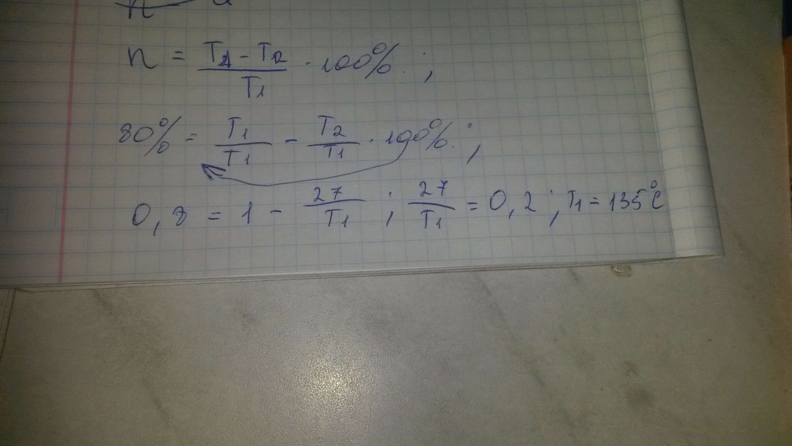 Mo. Какой доnкна быть температура нагреватели, для тоrо чтобы стало во можным досnжение значении KTUI тепловой машины 80%, если температуры холодиниха 27С?