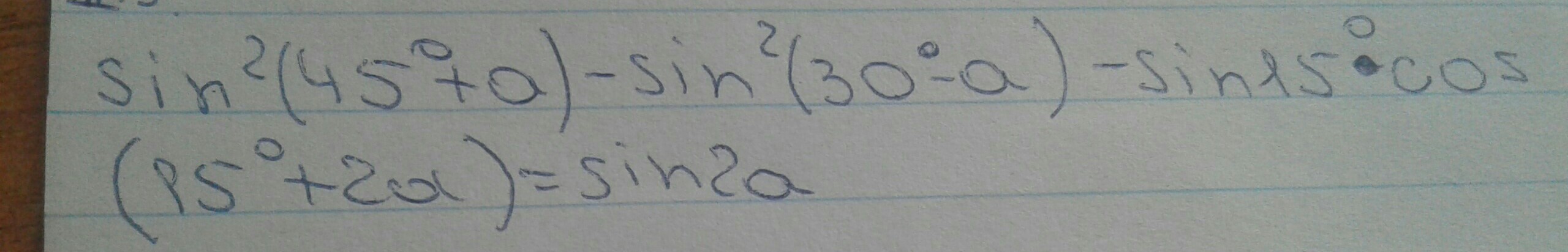 (sin(45+a))^2 - (sin(30 - a))^2 - sin(15)* cos(15 + 2*a) = sin(2*a);