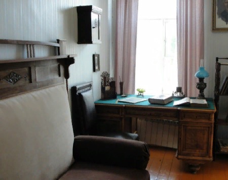 4. Кабинет. У окна письменный стол, на котором чернильный прибор и лампа. напротив напольные часы и камин. В простенке под большой картиной со сценой охоты стоит диван, на котором хозяин любит отдыхать после обеда. Однако сейчас он вертится с боку на бок. Размышляя, он, то прикладывает палец к виску, то проводит ладонью по шее.