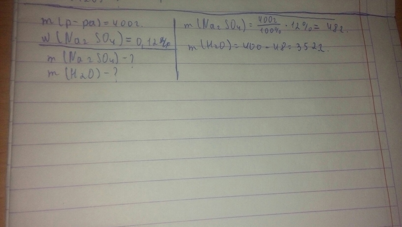 Какую массу соли и воды надо взять для приготовления расьвора с массовой долей сульфата натрия 0,12% и массой раствора 400г