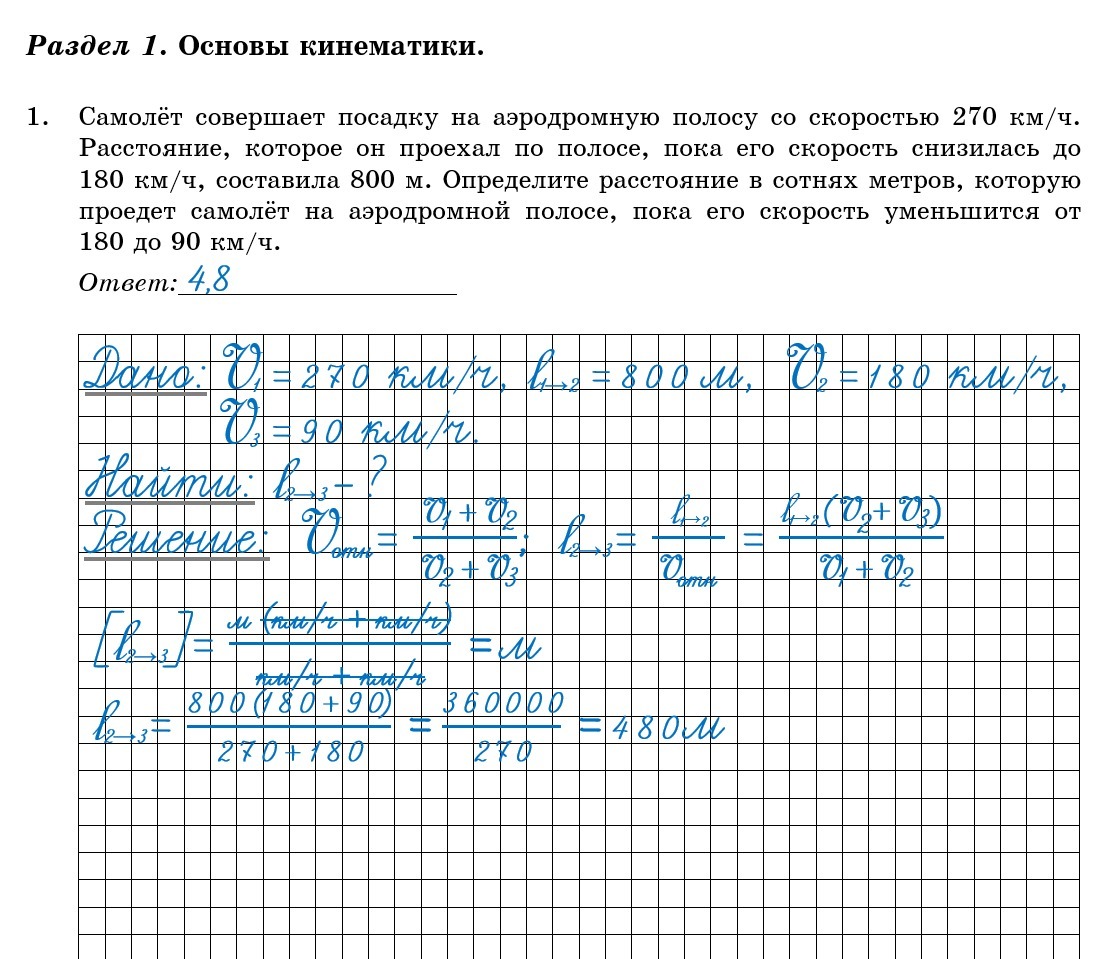 Самолёт совершает посадку на аэродромную полосу со скоростью 270 км/ч. Расстояние, которое он проехал по полосе, пока его скорость снизилась до 180 км/ч, составила 800 м. Определите расстояние в сотнях метров, которую проедет самолёт на аэродромной полосе, пока его скорость уменьшится от 180 до 90 км/ч.