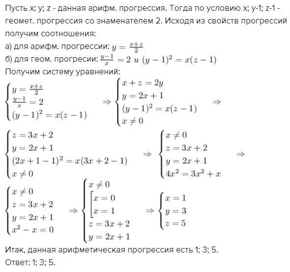 Пусть x; y; z - данная арифм. прогрессия. Тогда по условию х; у-1; z-1 - геомет. прогрессия со знаменателем 2. Исходя из свойств прогрессий получим соотношения: