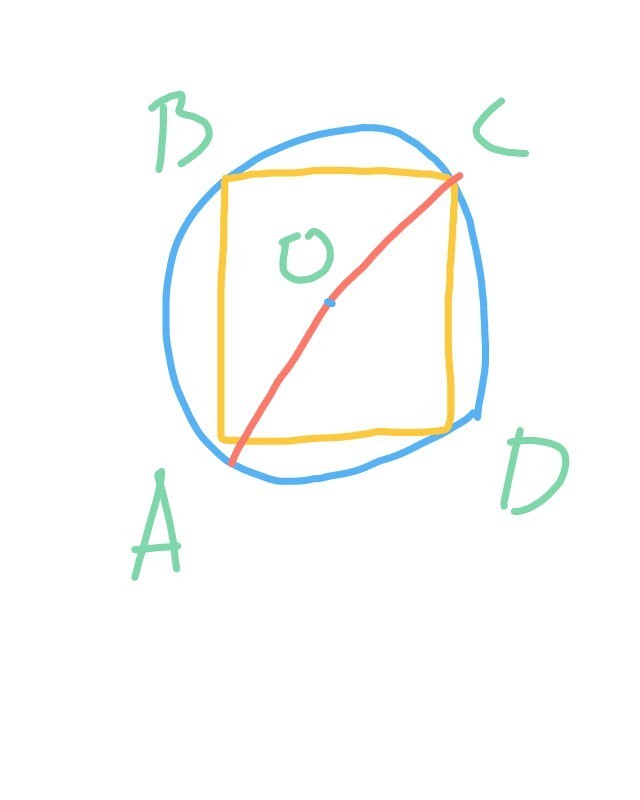 Необходимо по условию задачи найти радиус окружности, описанной около квадрата ABCD.