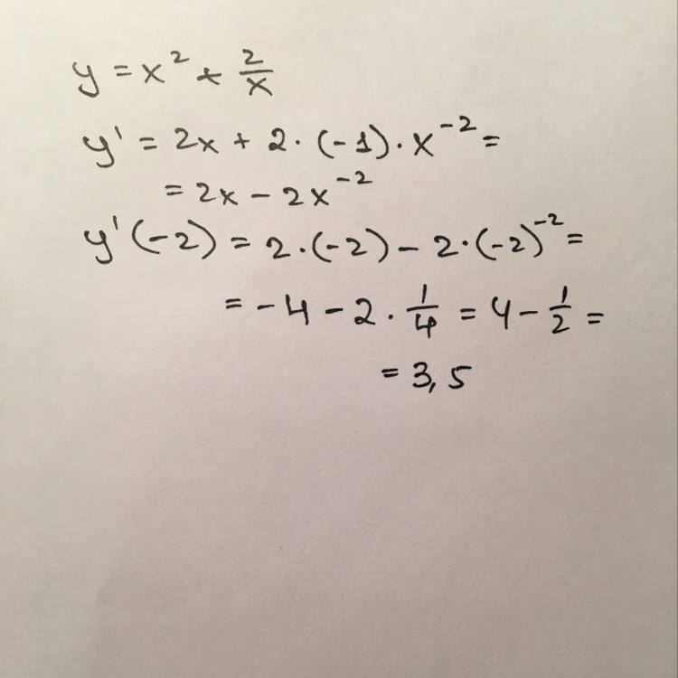 у '(х0)= у'(-2) = 2•(-2 ) - 2• (-2)^(-2) = - 4 -2• 0,25 = - 4 - 0,5 = - 4,5.