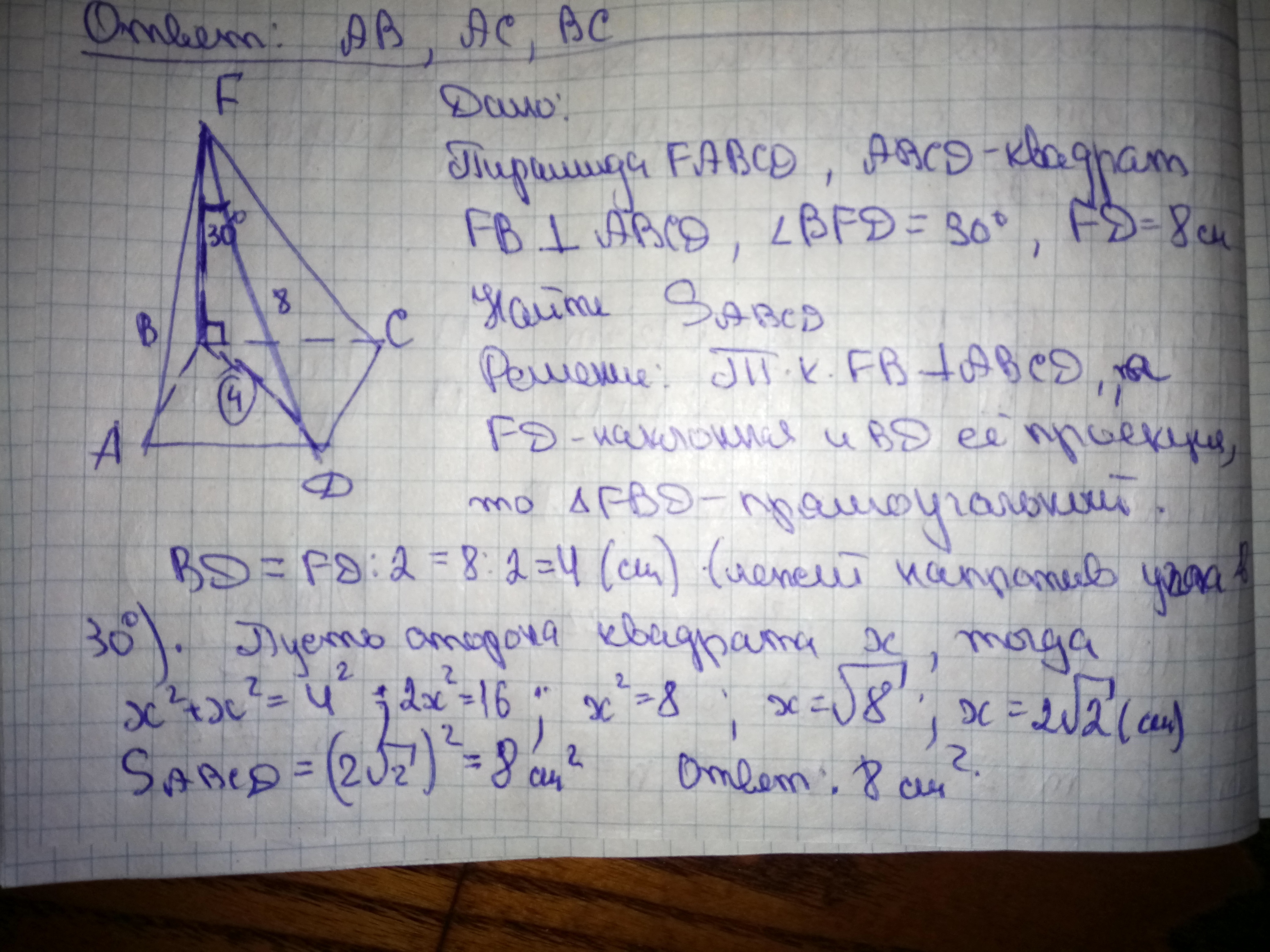 основанием пирамиды FABCD является квадрат ребро FB перпендикулярно к плоскости основания и образует с боковым ребром FD угол 30. FD = 8 см. Найдите площадь основания пирамиды