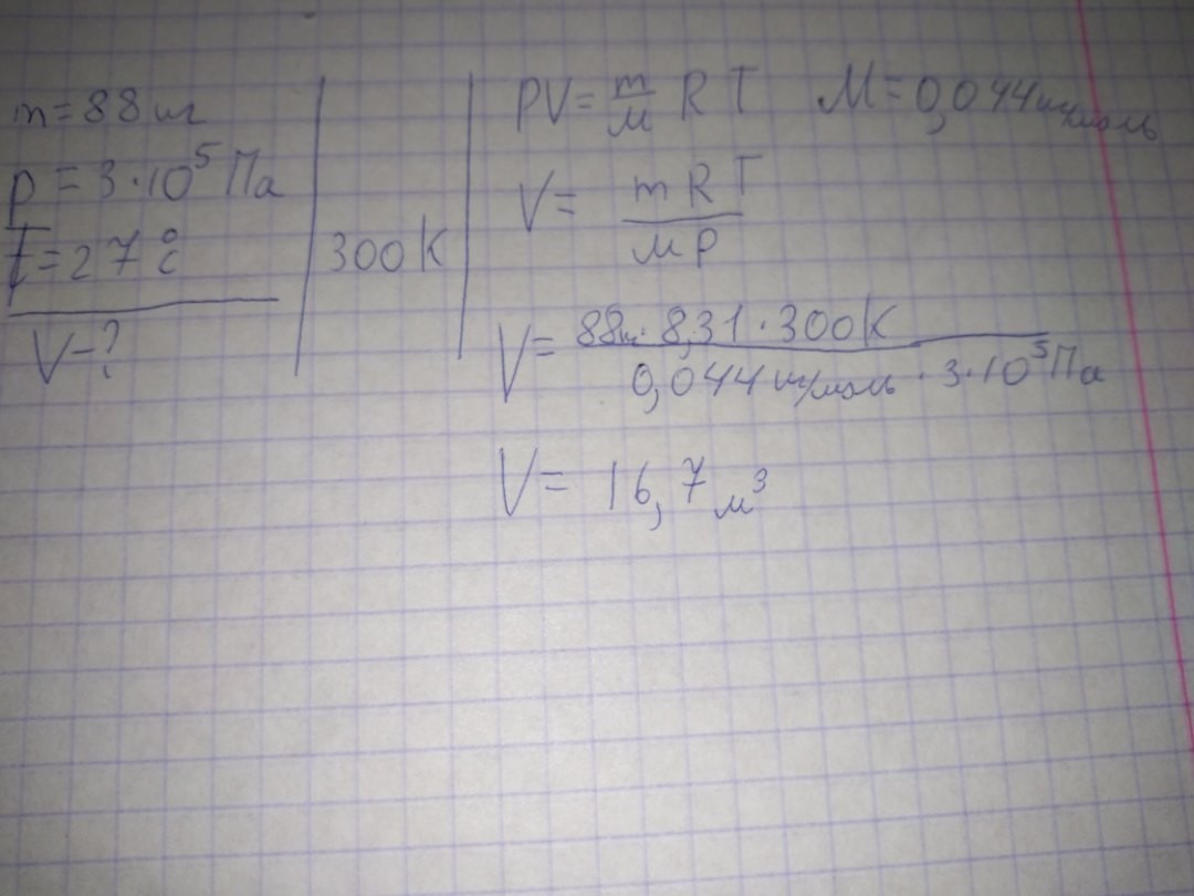 Извините, но вы не угадали с температурой. Какой объем занимает углекислый газ массой 88 кг при давлении 3∙10^5 Па и температуре 27 °С? (мне не понятно откуда появилось у ВАс число 273)