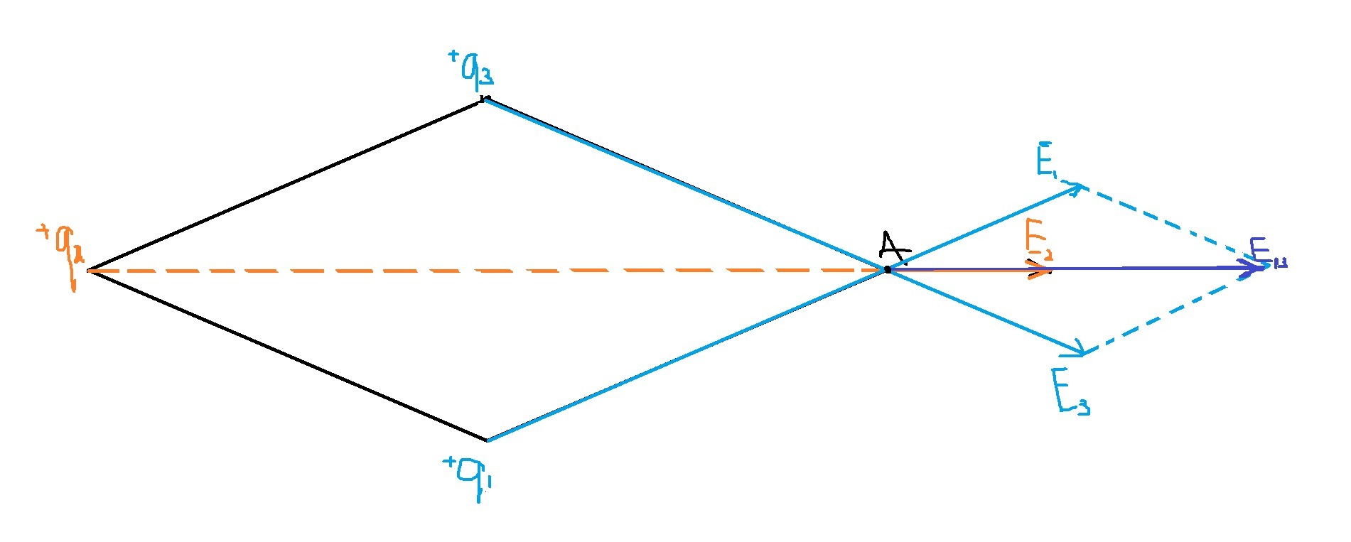 Линии напряженности будут напрямлены от положительных зарядов как показано на рисунке (к заряду если он отрицательный) . Сначала найдем длину большой диагонали ромба : d=a*√3=0.5*√3