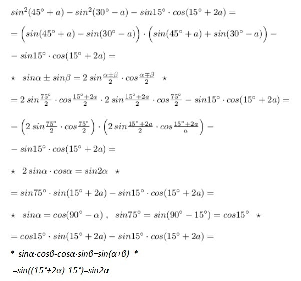 sin квадрат(45 градусов +а)-sin квадрат(30градусов - а)-sin15градусов умножить cos(15 градусов+2а)=sin2a