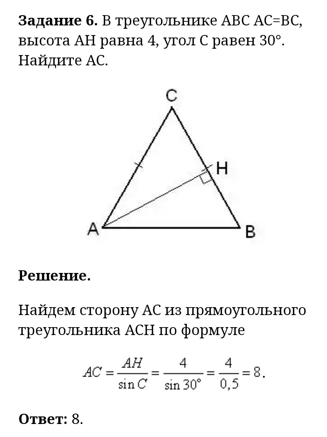 Задание 6. В треугольнике ABC AC=BC, высота AH равна 4, угол C равен 30°. Найдите AC.