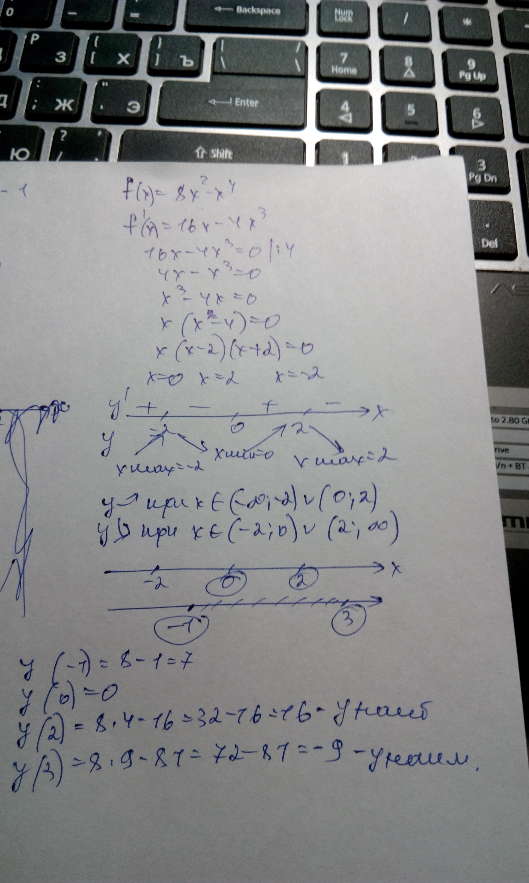 f (x)=8x^2-x^4 Найти промежутки возрастания, убывания. Точки Макс и мин. Наибольшее и наименьшее ее значение на промежутке (-1;3)