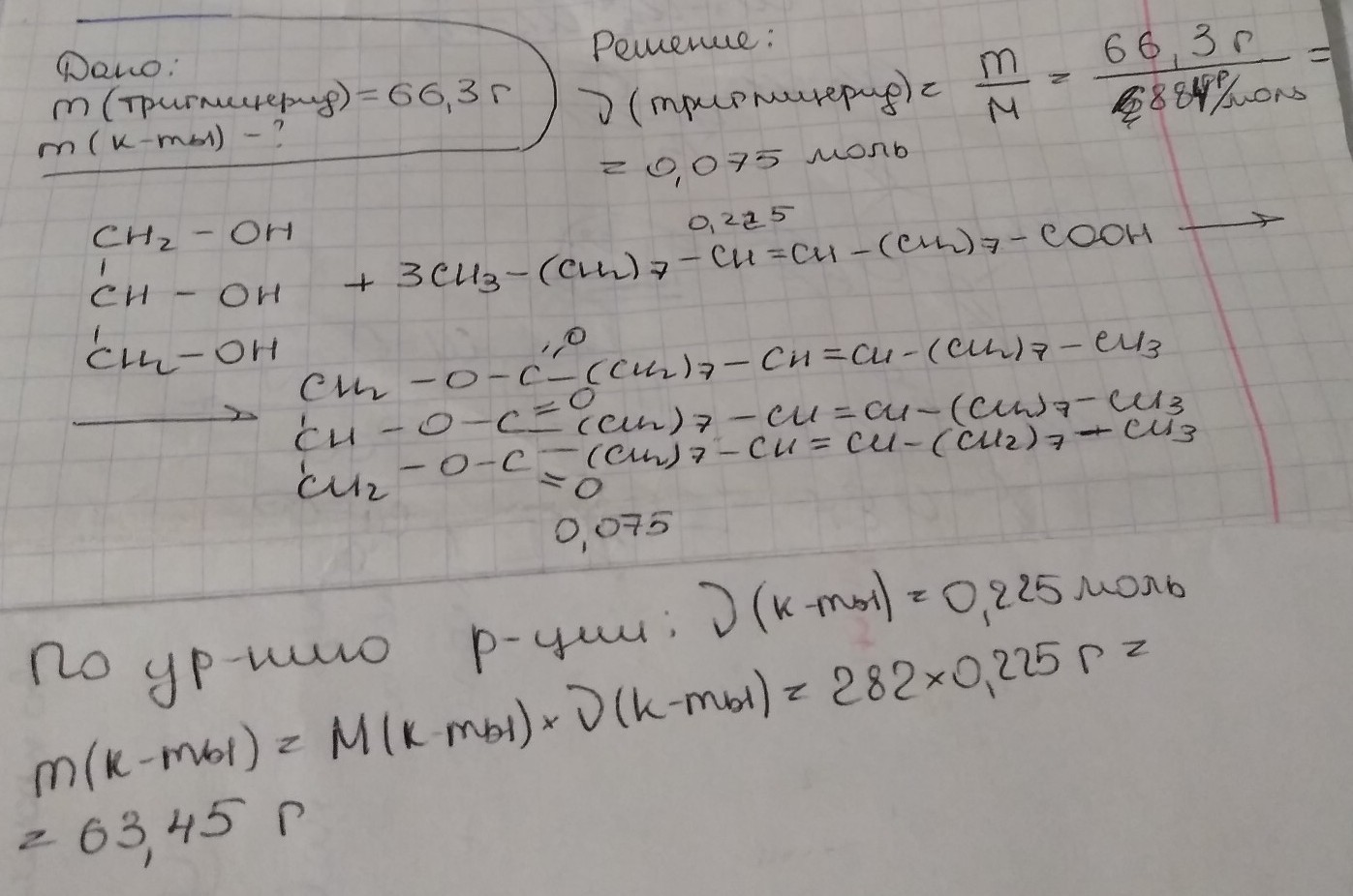 20 балл Помогите плиз,Масса олеиновой кислоты, которая требуется для получения 66,3 г триглицерида олеиновой кислоты