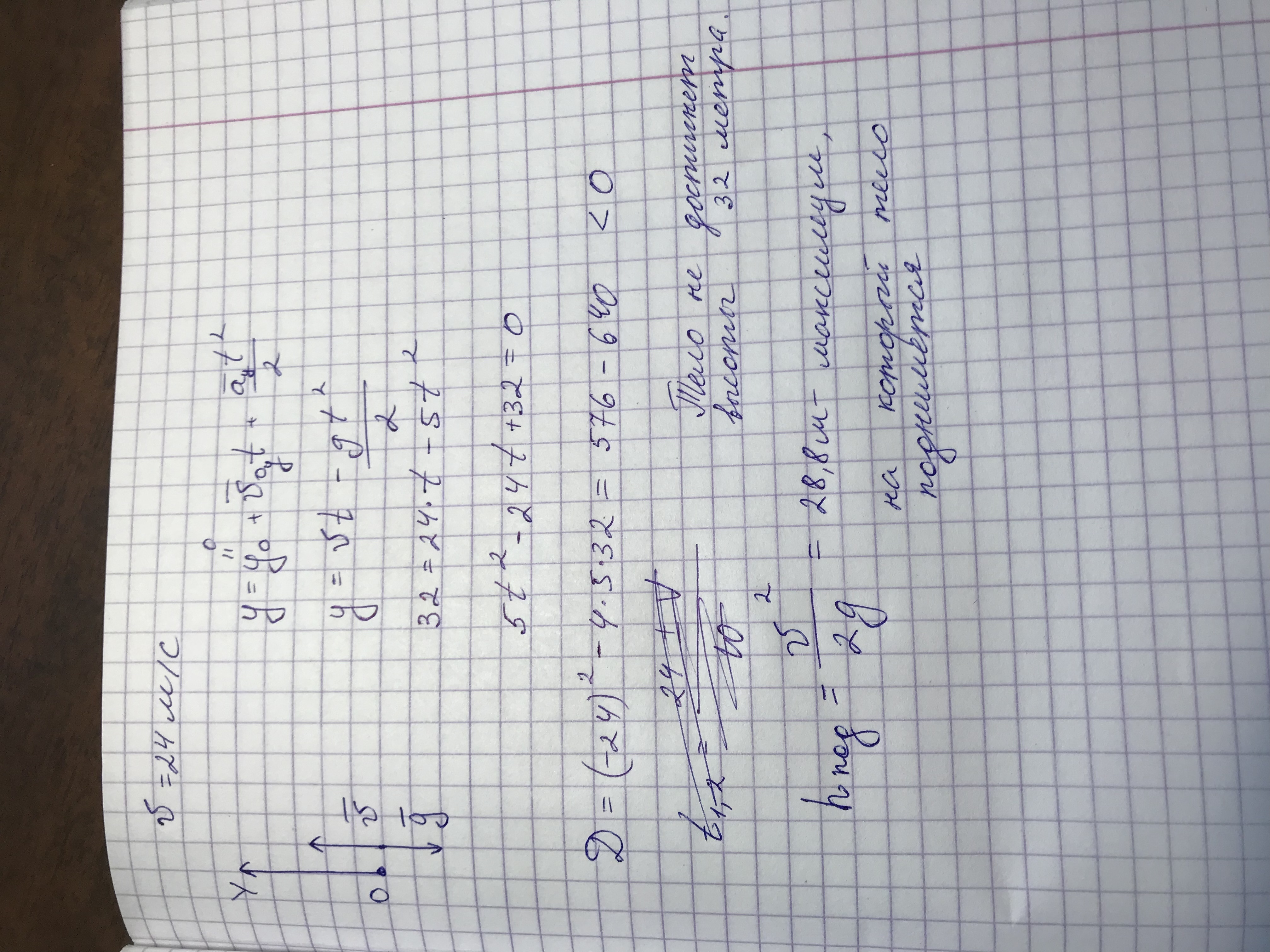 Тело бросили вертикально вверх со скоростью 24 м/с. Через какое время оно будет на высоте 32 м? *Полет свободный*