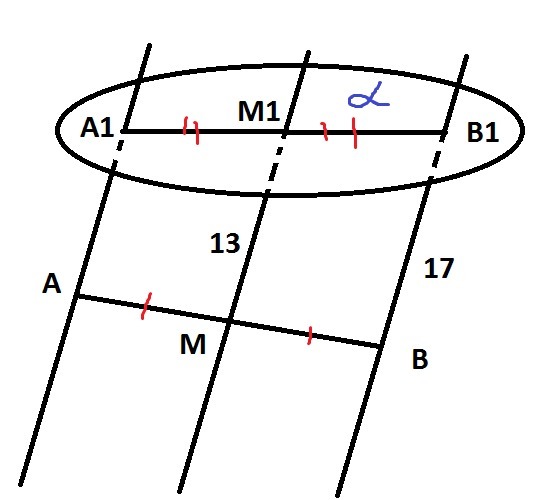 После построения чертежа видно, что AA₁B₁B - трапеция (так как AA₁ || BB₁, и MM₁ ≠ BB₁, а значит AB ≠ А₁В₁ )Также известно, что MM1 || AA1 || BB1, причем АМ=МВ, следовательно ММ₁ - средняя линия трапеции , тогда: