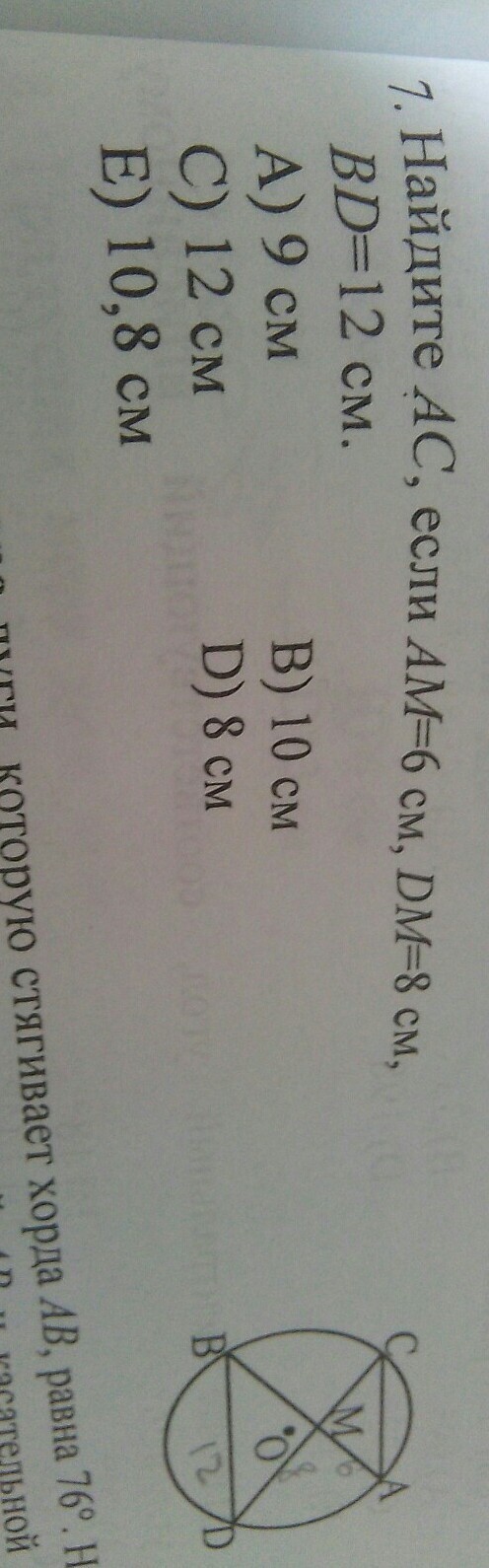 Вписанные углы, опирающиеся на равные дуги, равны: угСАВ=угСDB, угACD=угABD; угAMC=угBMD как противолежащие, следовательно тр-ки ACM и BDM подобны. Тогда отношение соответствующих сторон AC/BD=AM/BM, откуда AC=12*6/8= 9см
