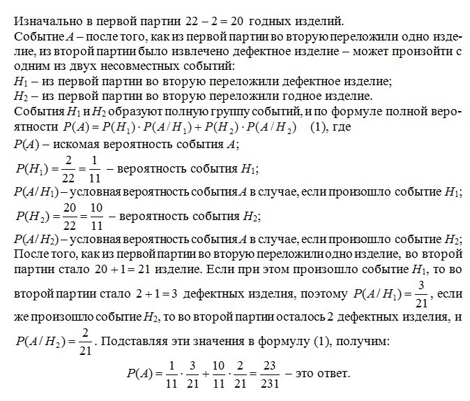 Є дві партії виробів(22 і 20 штук),причому в кожній партії по два вироби дефектні.Із першої партії в другу навмання переклали один виріб,а потім з другої теж навмання вийняли виріб.Знайти ймовірність того,що він дефектний