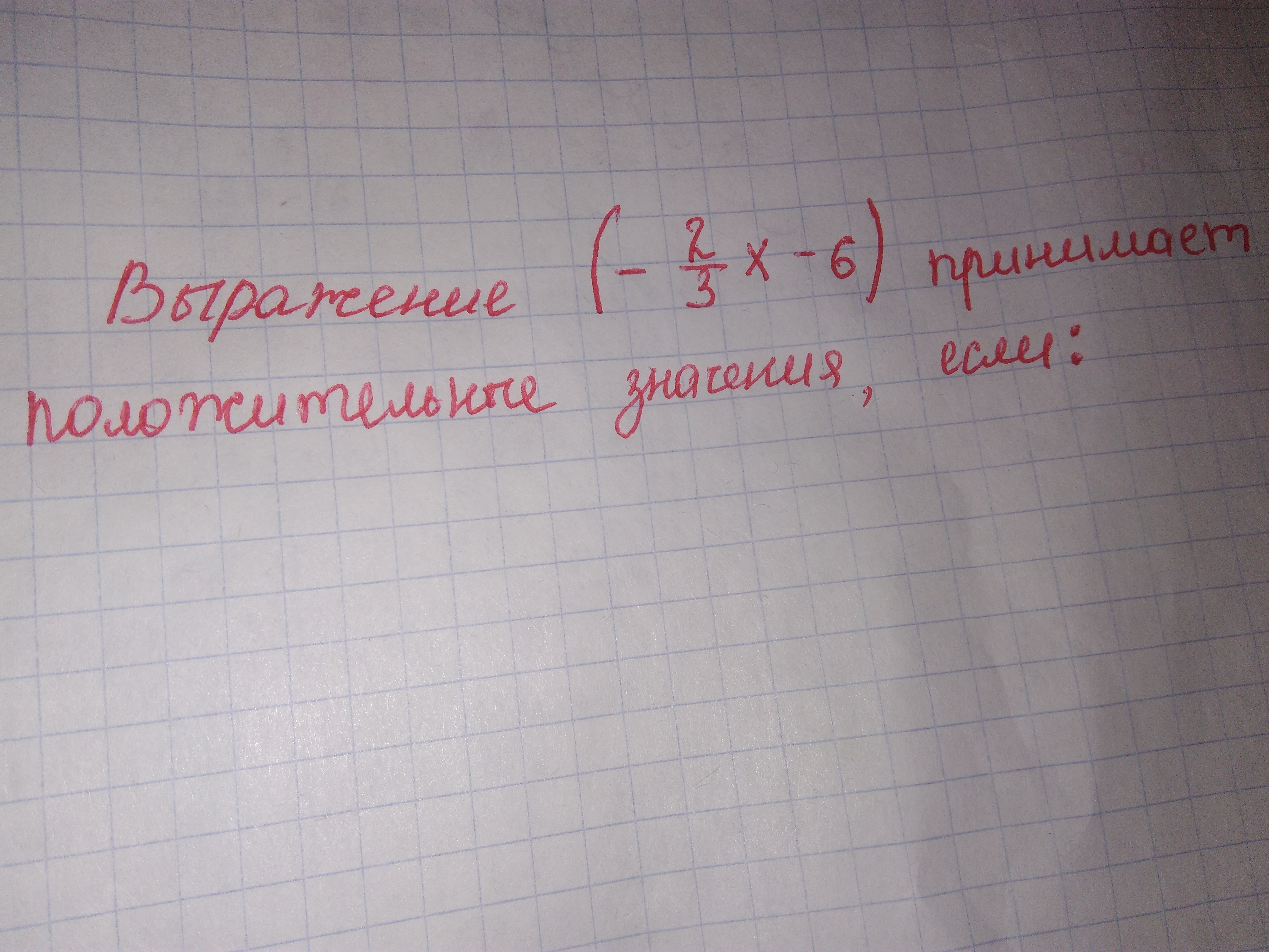 Выражение (- ²/₃ х - 6) принимает положительные значения, если х∈(-∞; -9)