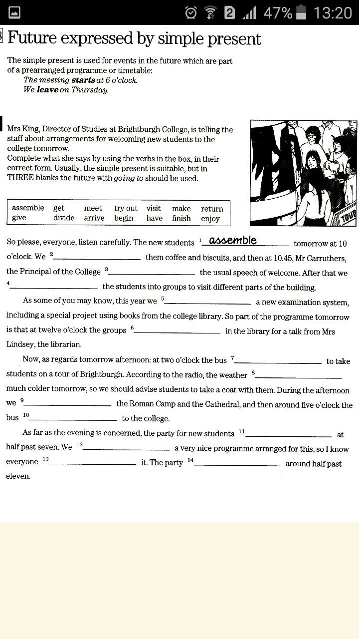 Mrs King, Director of Studies at Brightburgh College, is telling the staff about arrangements for welcoming new students to the college tomorrow. Complete what she says by using the verbs in the box. Usually, the simple present is suitable, but in THREE.