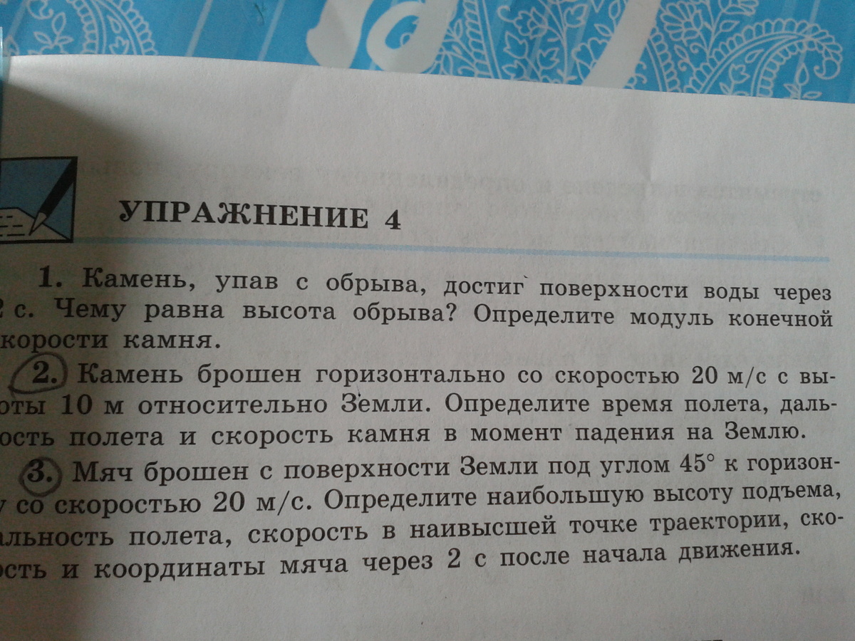 камень , упав с обрыва, достиг поверхности воды через 2 секунды чему равна высота обрыва определите модуль конечной скорости камня