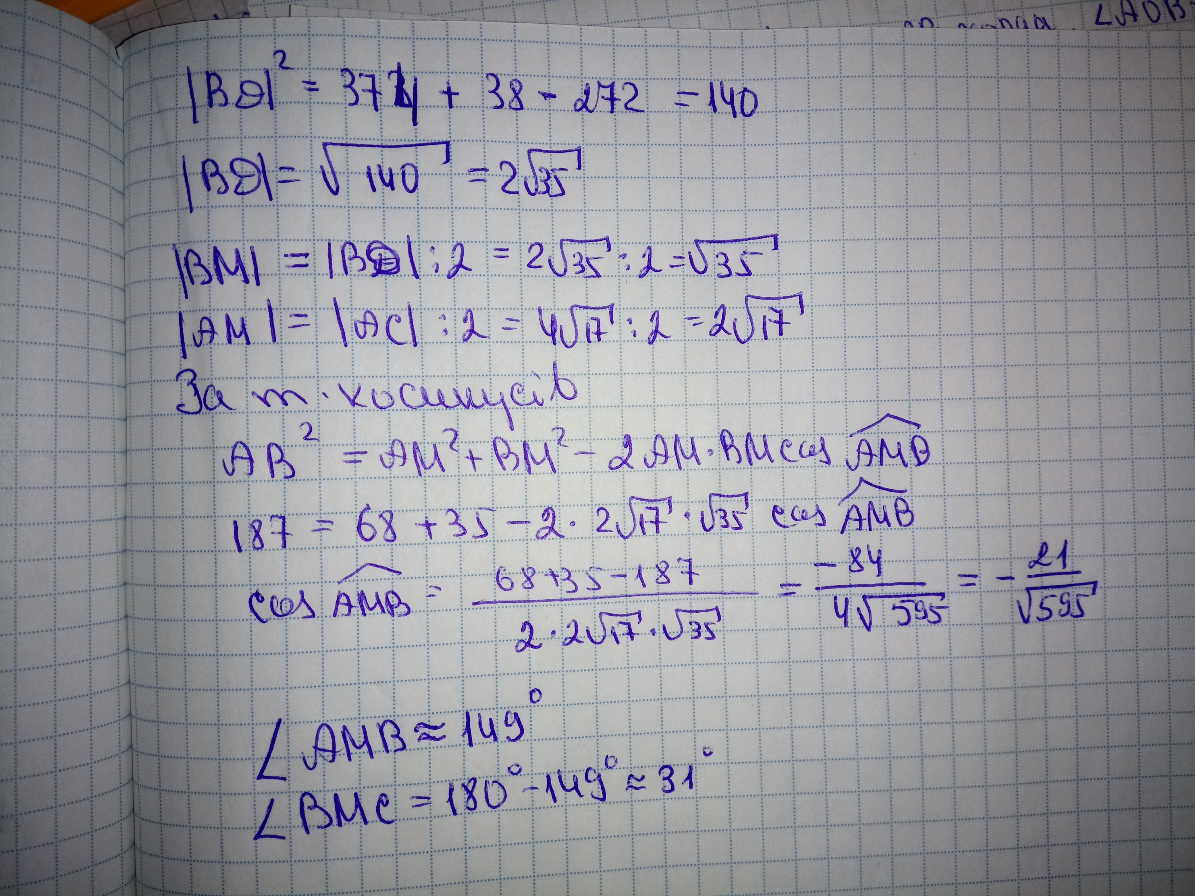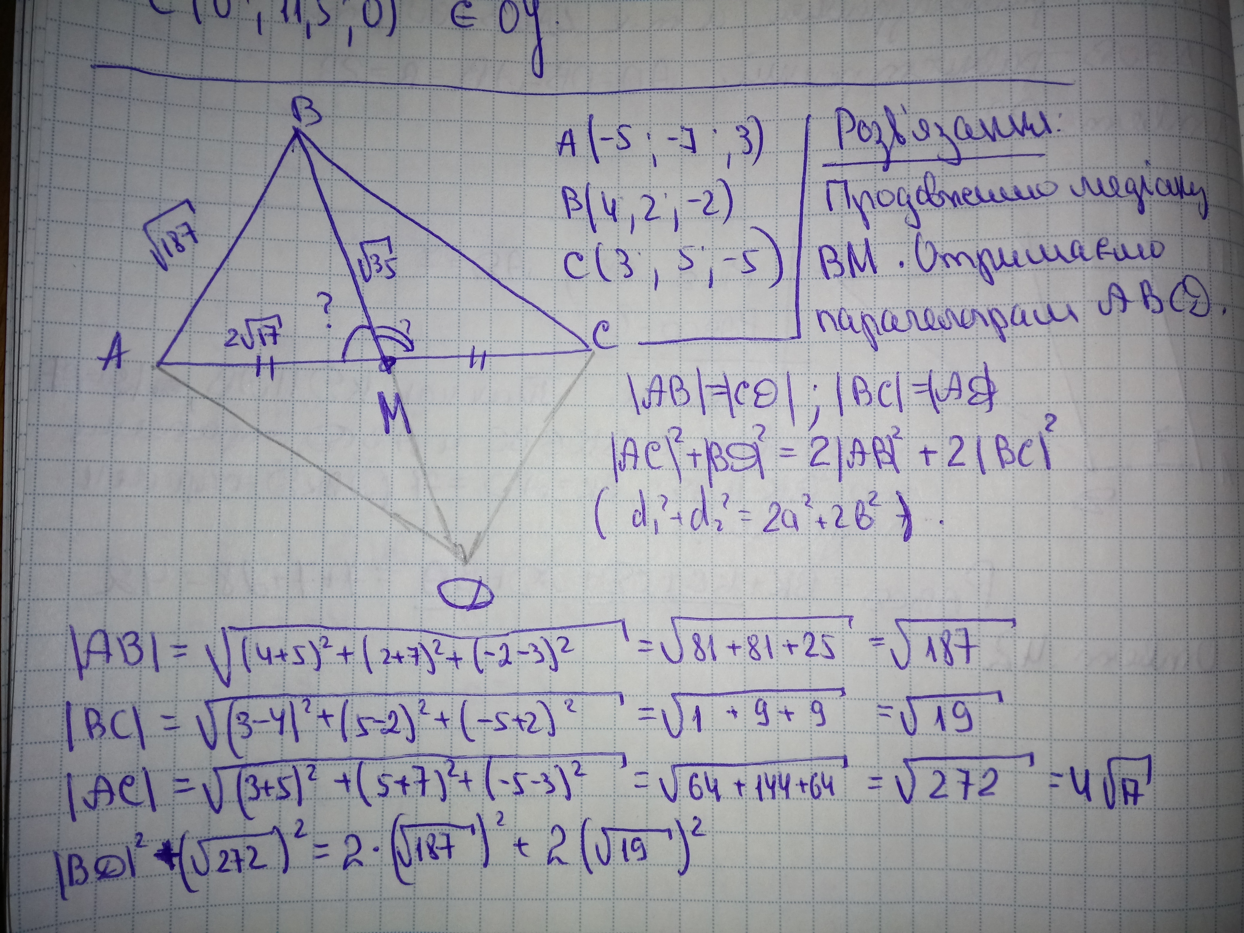 Знайти кут між стороною АС і медіаною ВМ трикутника ABC, якщо А (-5. -7. 3) B (4. 2. -2) C (3. 5. -5.)