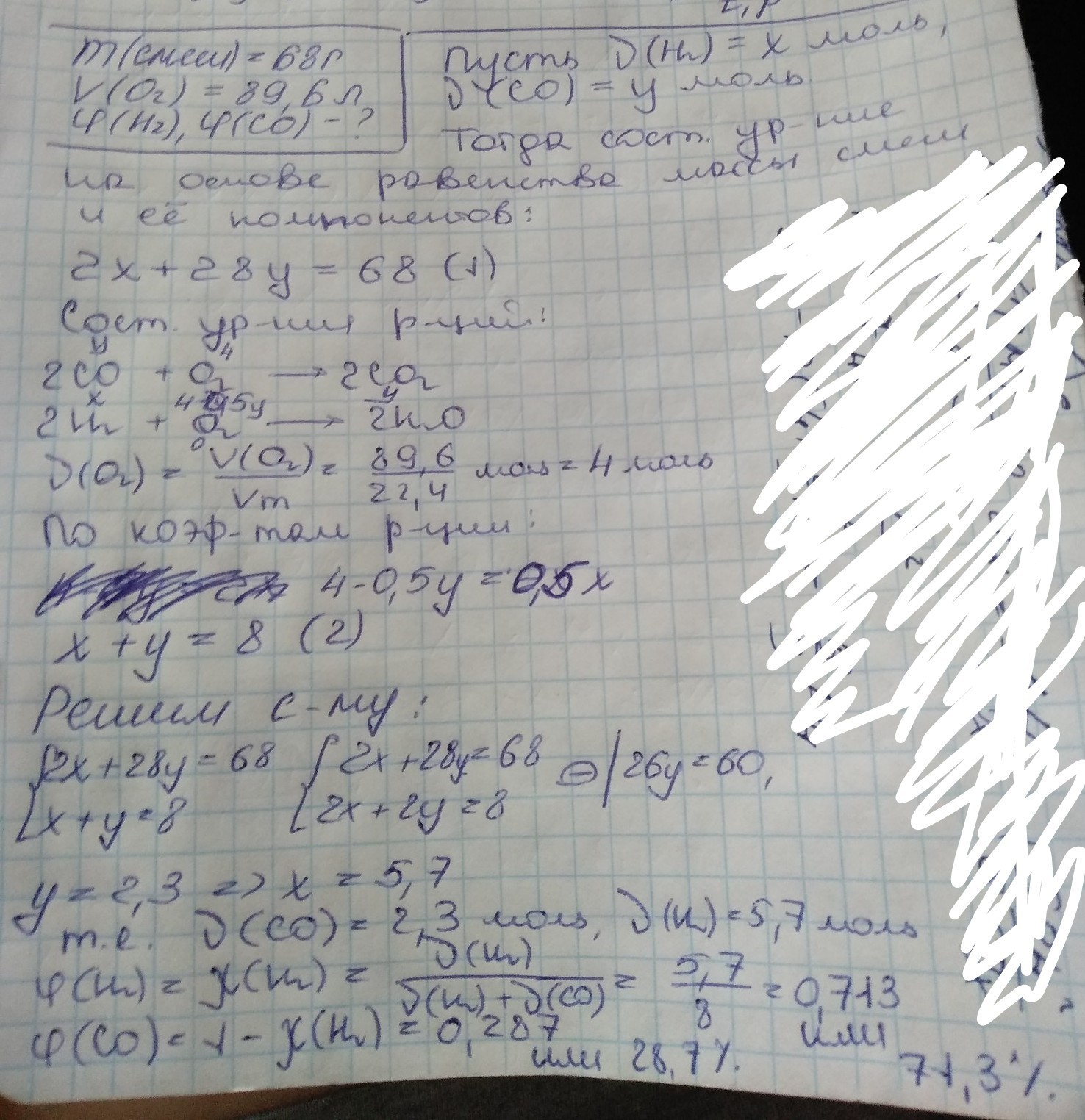 При сжигании смеси водорода и оксида углерода (II) массой 68 г израсходован кислород объемом 89,6 л (н. у.). Определите объемную долю каждого газа в смеси