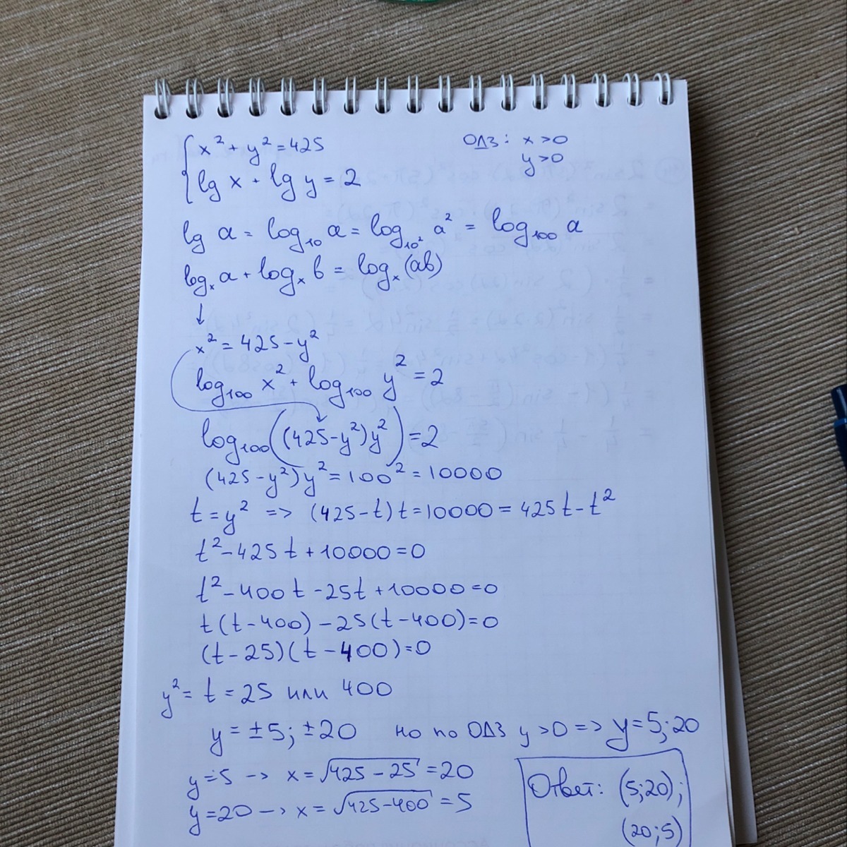х² = 400 С учётом ОДЗ получаем х = 20, а у = 5