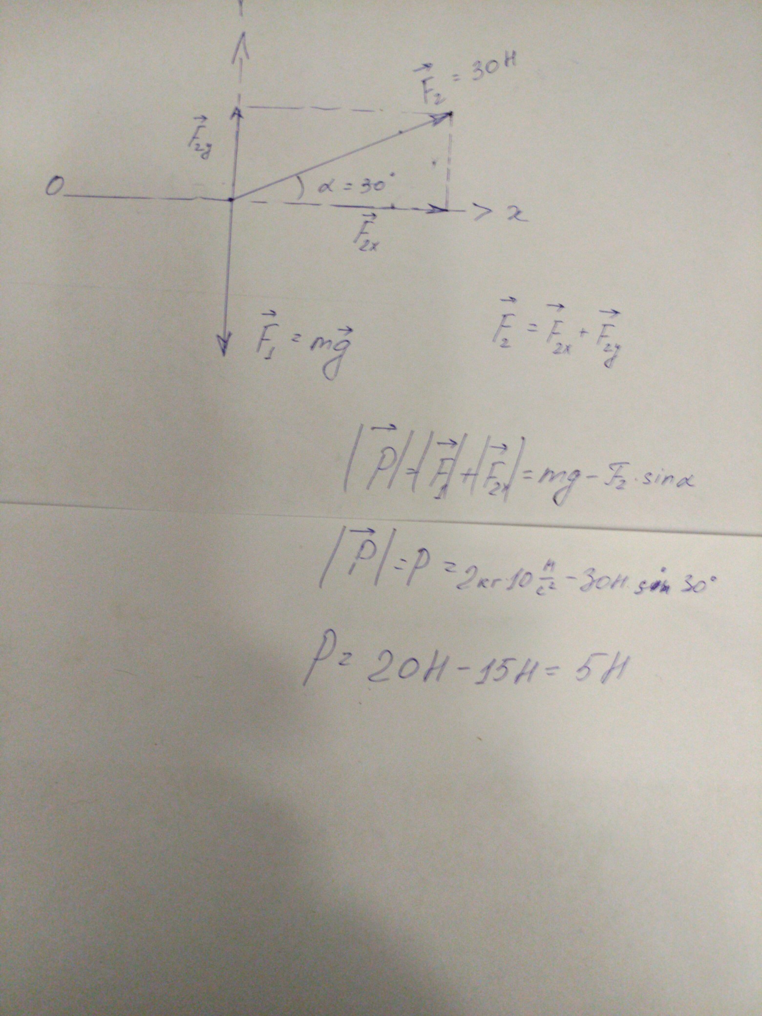 На тело массой 2 кг, находящееся на гладком горизонтальном столе, действует сила 30 Н, направленная вверх под углом 30 градусов к горизонту. С какой силой тело давит на стол ?