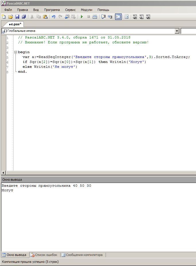 if Sqr(a[2])=Sqr(a[0])+Sqr(a[1]) then Writeln('Могут')